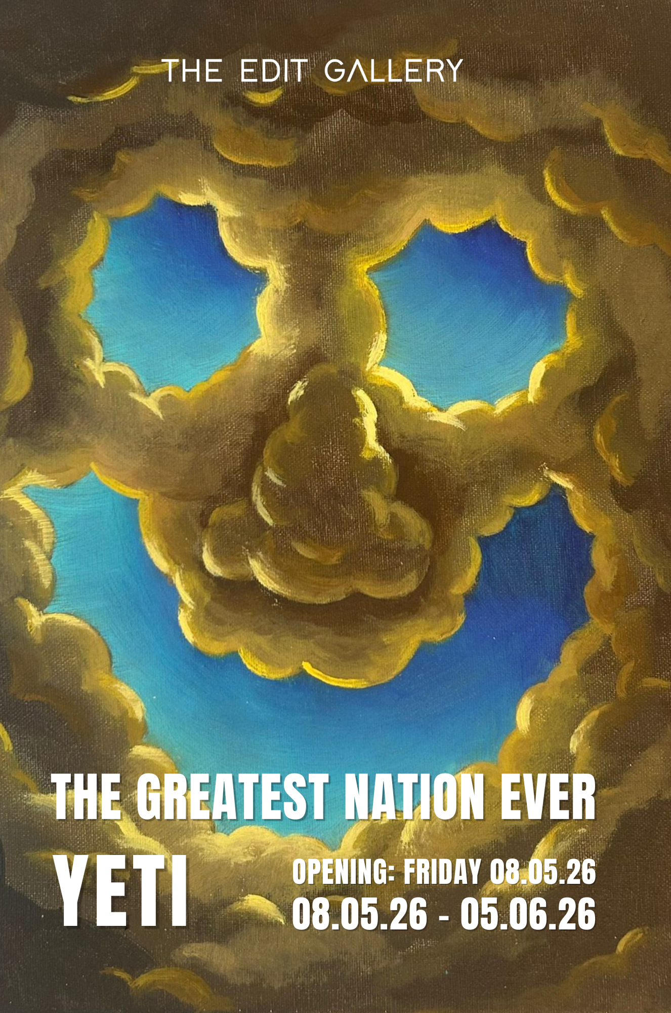 The Edit Gallery presents The Greatest Nation Ever, the first solo exhibition by Yeti at the gallery. The works unfold imagined worlds shaped by power, belief, and perception, unstable and shifting, much like the reality they echo.